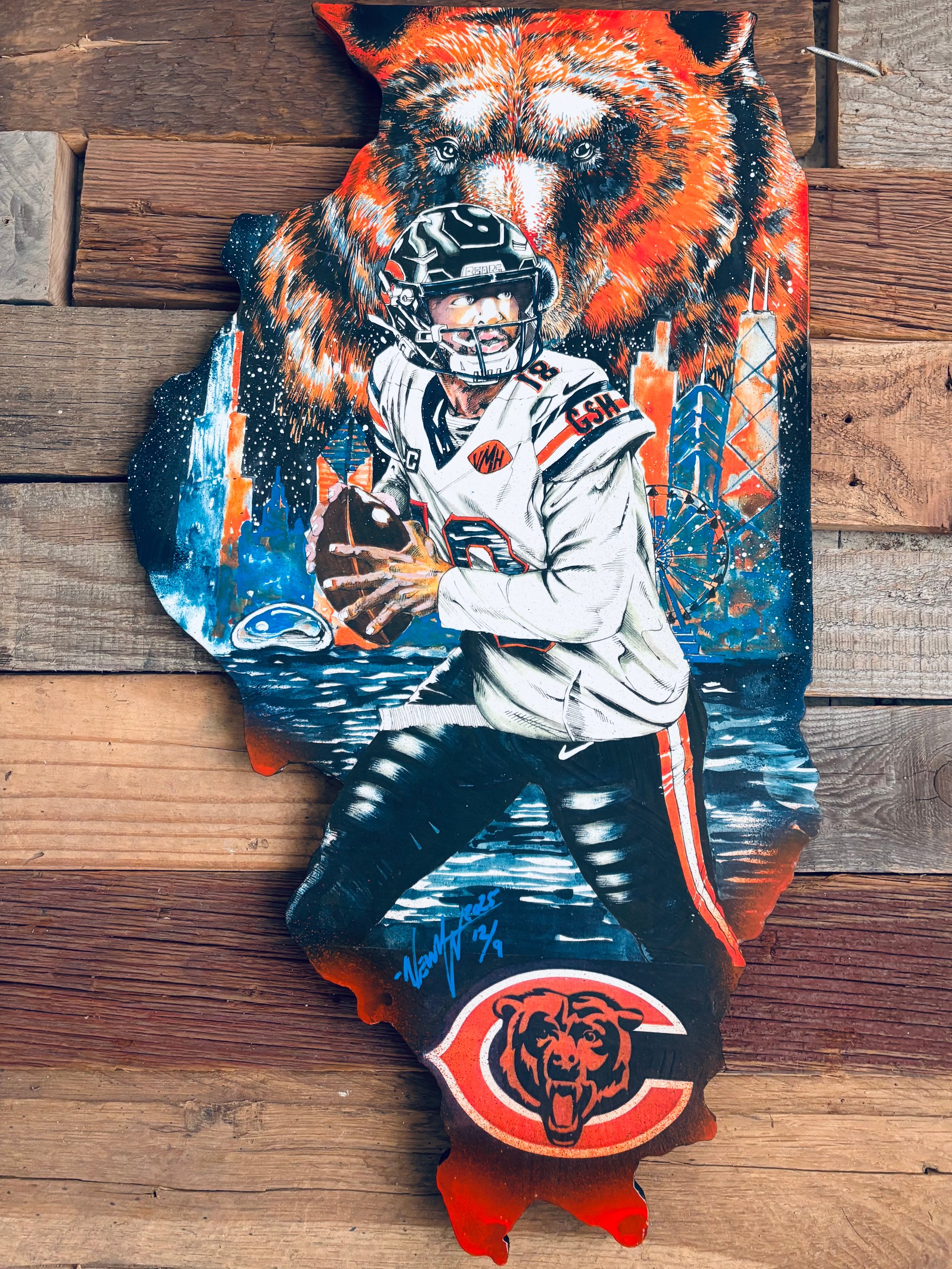 Image of Chicago Bears quarterback Caleb Williams in front of the Windy City backed by the team’s namesake and mascot. 1st cut signed and numbered 1/25 Painted on a wooden cutout of Illinois measuring 11x22