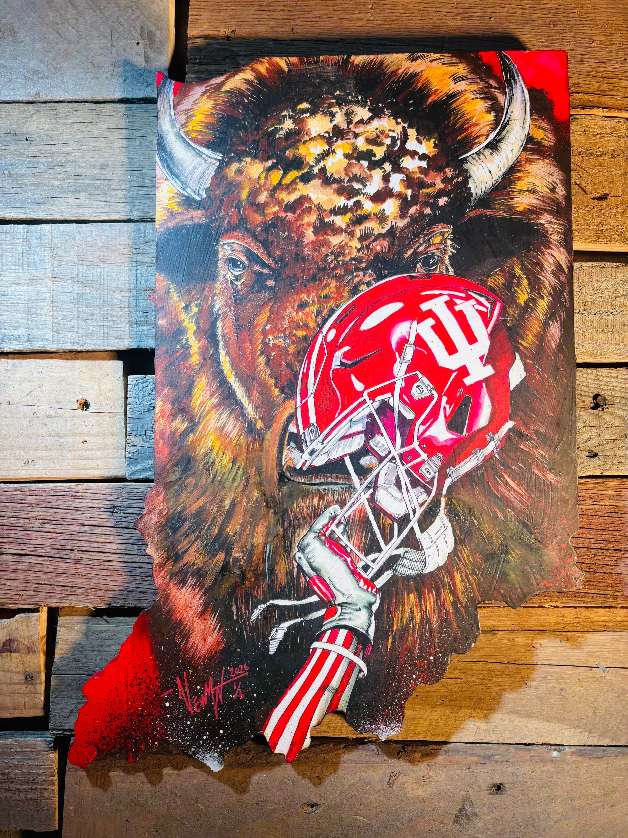 Celebrating the amazing turnaround of the Indiana Hoosiers college football program and the influence of the emerging Bison mascot with the 2025/2026 football program. Image is a hand painted reproduction illustrated in pen and ink , acrylics, and dyes on a 12x18 wooden cutout of the state of Indiana.