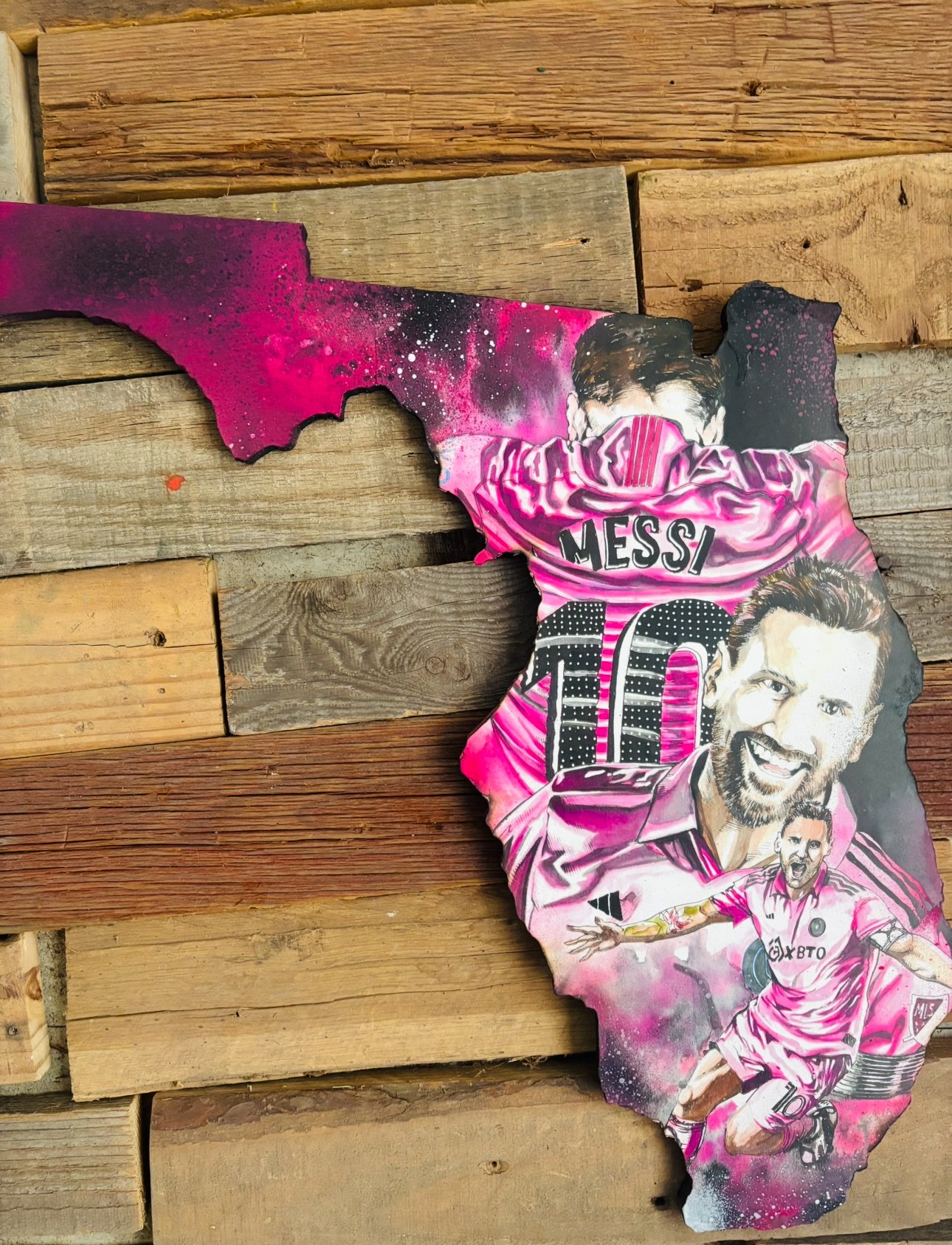 Lionel Messi images painted on a wooden cutout of Florida. 1st cut signed and numbered 1/25