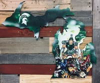 (Licensed through Michigan States Crafter License Program)Hand made wood cut of the state of Michigan Illustrated using both its upper and lower peninsulas. The upper illustrating The Spartans iconic logo and the lower illustrating Sparty standing over a pile of his Big 10 foes. The art measures 13 X 23 (upper) and 19X15 (Lower) 1/4 inch thick and makes perfect for hanging in your man cave or she shed. The sturdy wood cut also displays nicely on your mantel or shelf in a stand.